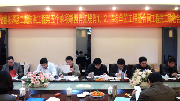 驗(yàn)收會由江西省鄱陽湖區(qū)二期防洪工程第五個(gè)單項(xiàng)工程建設(shè)項(xiàng)目部副主任陶理志主持,建設(shè)項(xiàng)目部總工程師鄒軍賢、宜春市水利局劉啟明副局長、樟樹市水利局吳學(xué)輝、公司副總經(jīng)理胡鴻煌等出席了驗(yàn)收會。