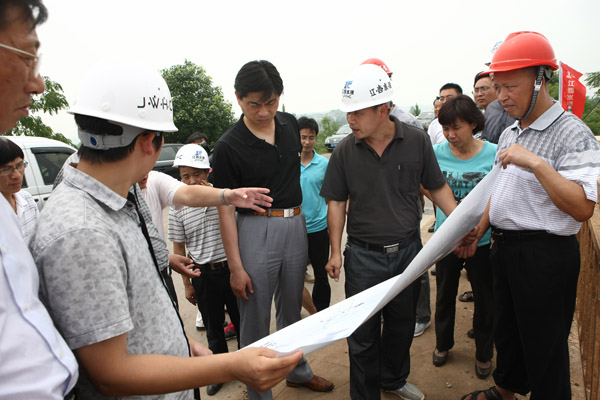 孫曉山廳長(zhǎng)一行深入查看了樟山庫區(qū)防護(hù)工程的施工現(xiàn)場(chǎng),并認(rèn)真聽取了我公司項(xiàng)目經(jīng)理彭紅軍對(duì)工程整體布置、進(jìn)度及工程施工中遇到的困難和問題等的簡(jiǎn)要匯報(bào)。樟山防護(hù)工程施工戰(zhàn)線長(zhǎng)、作業(yè)難度大、牽涉的范圍點(diǎn)多面廣,是峽江水利樞紐庫區(qū)防護(hù)工程施工難度最大的項(xiàng)目之一,孫廳長(zhǎng)對(duì)工程進(jìn)展情況非常關(guān)心。聽取匯報(bào)后,孫廳長(zhǎng)指出:一是要做好民生工程,做好移民、征地、拆遷等工作,為工程施工提供便利;二是要爭(zhēng)取早日施工,在早稻收割完成后立即進(jìn)行工程施工,確保工程于明年7月份完成主體工程;三要合理安排施工工期,確保峽江水利樞紐蓄水及第一臺(tái)發(fā)電機(jī)組按期發(fā)電。