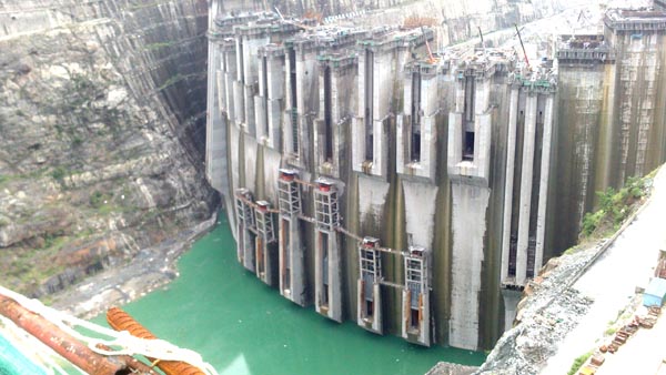 溪洛渡水電站位于四川省雷波縣和云南省永善縣接壤的金沙江峽谷段,是金沙江水電基地下游四個巨型水電站中最大的一個,以發(fā)電為主,兼有攔沙、防洪和改善下游航運等綜合效益的大型水電站。溪洛渡水電站樞紐由攔河壩、泄洪、引水、發(fā)電等建筑物組成。攔河壩為混凝土雙曲拱壩,壩頂高程610米,最大壩高278米,壩頂弧長698.07米;左、右兩岸布置地下廠房,各安裝9臺水輪發(fā)電機組,單機容量77萬千瓦,電站總裝機1386萬千瓦,多年平均發(fā)電量571.2億千瓦時。裝機容量與原來世界第二大水電站——伊泰普水電站(1400萬千瓦)相當(dāng),是中國第二、世界第三大水電站。