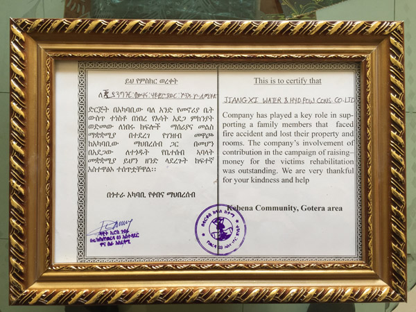 近期,在我辦事處所在地社區(qū)居民Alemayehu Bekele家不幸遭遇無情火災、家庭陷入極度困境的時刻,江西水建駐埃分公司向其伸出援手,助其迅速重建家園。事后,Gotera社區(qū)協(xié)調員及警察所官員一行為我公司這種義舉表示贊賞并頒發(fā)了感謝證證書。
