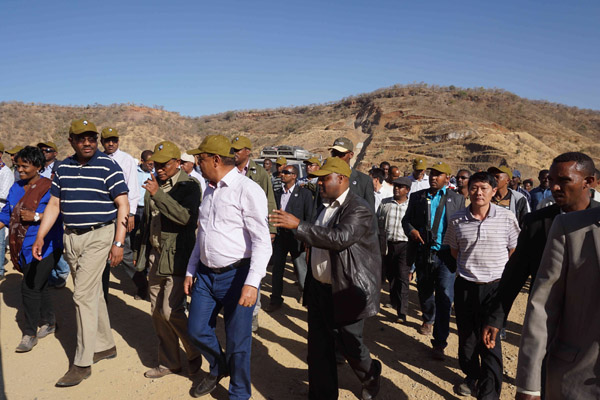 下午3時許,總統(tǒng)、總理和議長抵達工地后,就頂著40度的高溫馬不停蹄趕往主壩和灌溉隧洞引水渠,詳細視察現場情況。承包商Sur公司負責人Tadesse Yemane向三位領導報告了工程概況和現場進度,并介紹了整個大壩防滲的關鍵部分——基礎灌漿和瀝青混凝土芯墻——是由江西水建承建的。公司項目經理黃生寶向三位領導簡要匯報了灌漿項目的完成情況,并表達了又好又快完成瀝青混凝土芯墻和灌溉隧洞的堅定決心和信心。領導們對我公司的成績表示肯定,希望我們再接再厲、優(yōu)質高效地完成接下來的工作,為早日實現蓄水和灌溉做出努力。