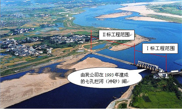 撫河焦石壩水庫的主要作用是抬高撫河水位,引水灌溉撫州、宜春、南昌三市七縣(市、區(qū))37個鄉(xiāng)鎮(zhèn)共120萬畝農(nóng)田,近年來又為南昌市及周邊城鎮(zhèn)提供工業(yè)、生活和環(huán)境用水約2×108 m3/年,社會、經(jīng)濟效益十分明顯。撫河焦石壩水庫除險加固工程分兩期實施,一期攔河閘壩加固工程劃分為一個標段,二期工程劃分為三個標段,我公司中標承建了一期工程(即Ⅰ段段)和二期工程中的Ⅱ標段。