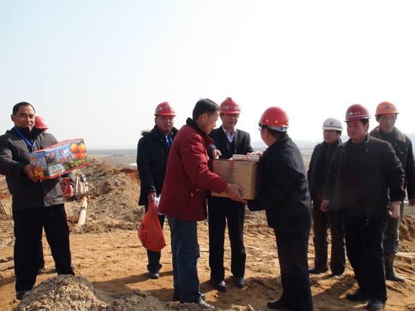 2011年2月3日,年初一上午,省河湖局郭澤杰局長(zhǎng)一行到垂直防滲4標(biāo)親切看望并慰問(wèn)項(xiàng)目部人員。我司董事長(zhǎng)總經(jīng)理王元旦、上饒市水利水電工程建設(shè)監(jiān)理中心總經(jīng)理聶道淵等陪同慰問(wèn)。
