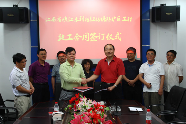 公司董事長(zhǎng)總經(jīng)理王元旦與峽江水利樞紐總指揮吳義泉簽訂施工合同