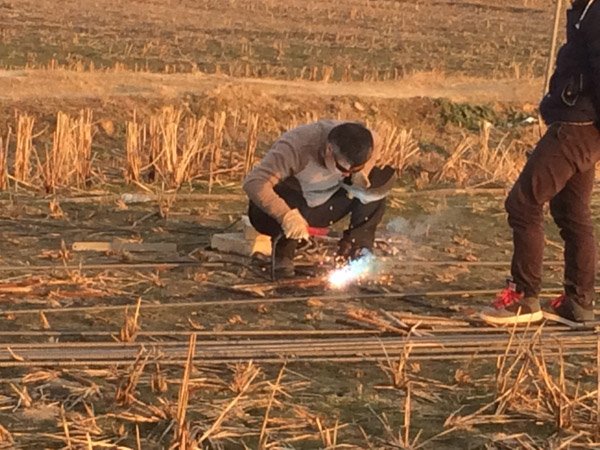 圖為官田機(jī)耕橋鋼筋制作現(xiàn)場(chǎng),圖中為李金瑞經(jīng)理在點(diǎn)焊鋼筋